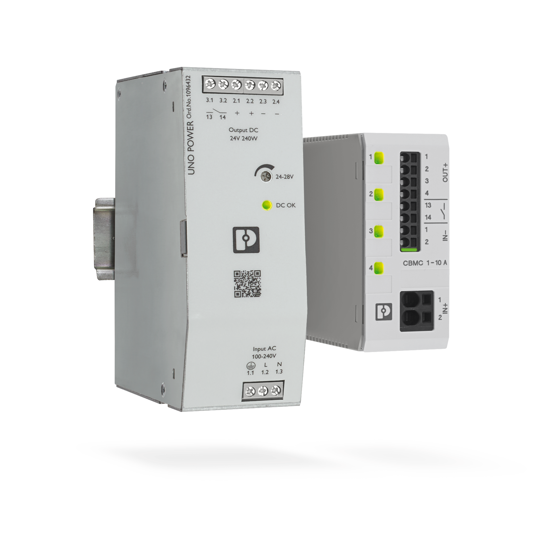 通过搭配使用紧凑型UNO POWER电源和CBMC电子式断路器,即可在节省安装空间的同时确保高系统可用性。UNO POWER电源配备浮空开关触点,轻松完成输出电压系统诊断。此外,电源还凭借其高功率密度和高效率特性大幅节省了空间与能源。