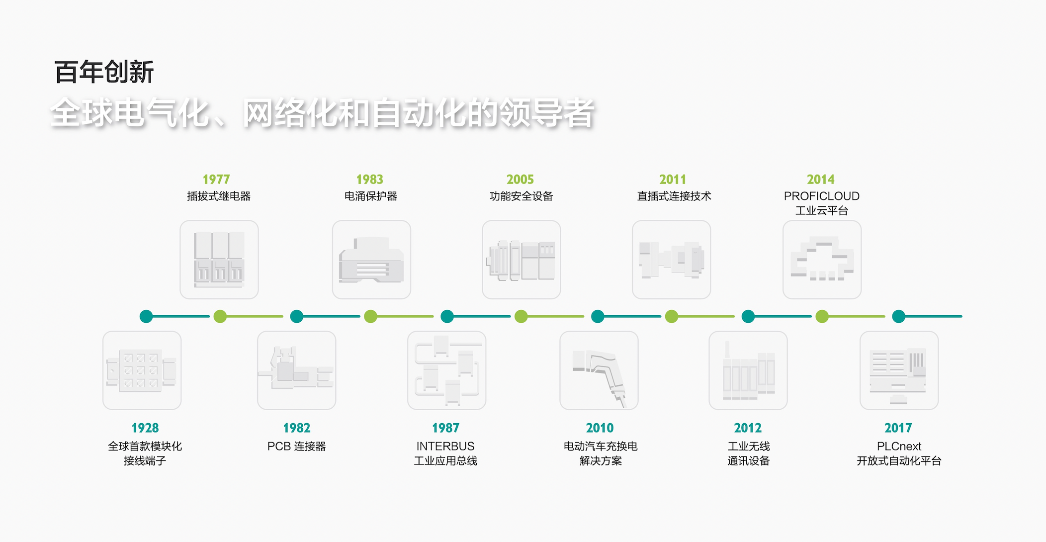 百年来菲尼克斯电气一直携手客户和合作伙伴研发创新产品和解决方案,助力万物互联。我们以此为基础打造遍布全球的增值流程,成就造福全人类的宜居未来。